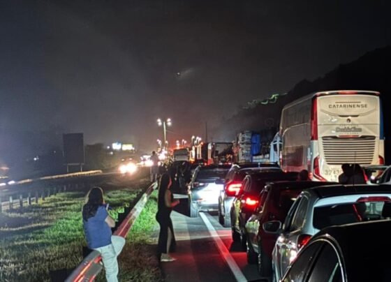 Acidente entre caminhões causa incêndio e interdita BR-101 em Tijucas