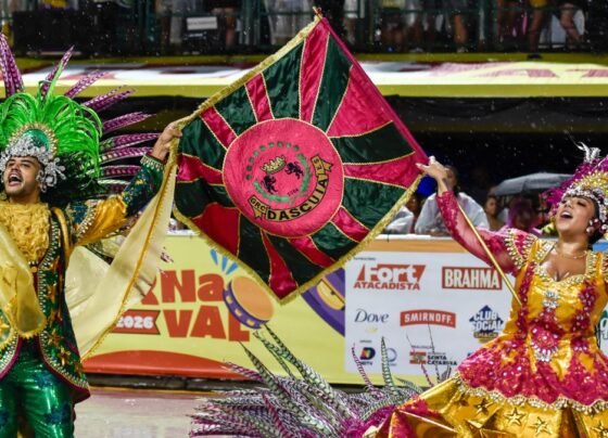 Mestre-sala e porta-bandeira da Dascuia em 2026Foto: Mafalda Press / Divulgação / ND Mais “Sou resistência, matriarca da igualdade… “.…