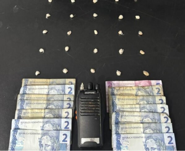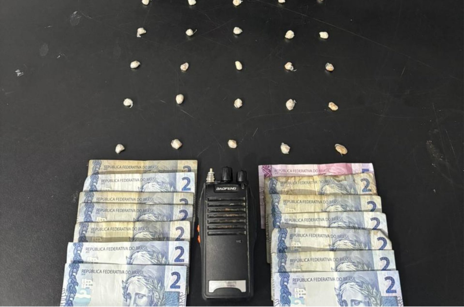 Durante a revista, os agentes encontraram 31 pedras de crack embaladas e prontas para a venda, além de R$ 31 em espécie, um smartphone e um rádio comunicador — equipamento frequentemente utilizado para monitorar a ação policial.