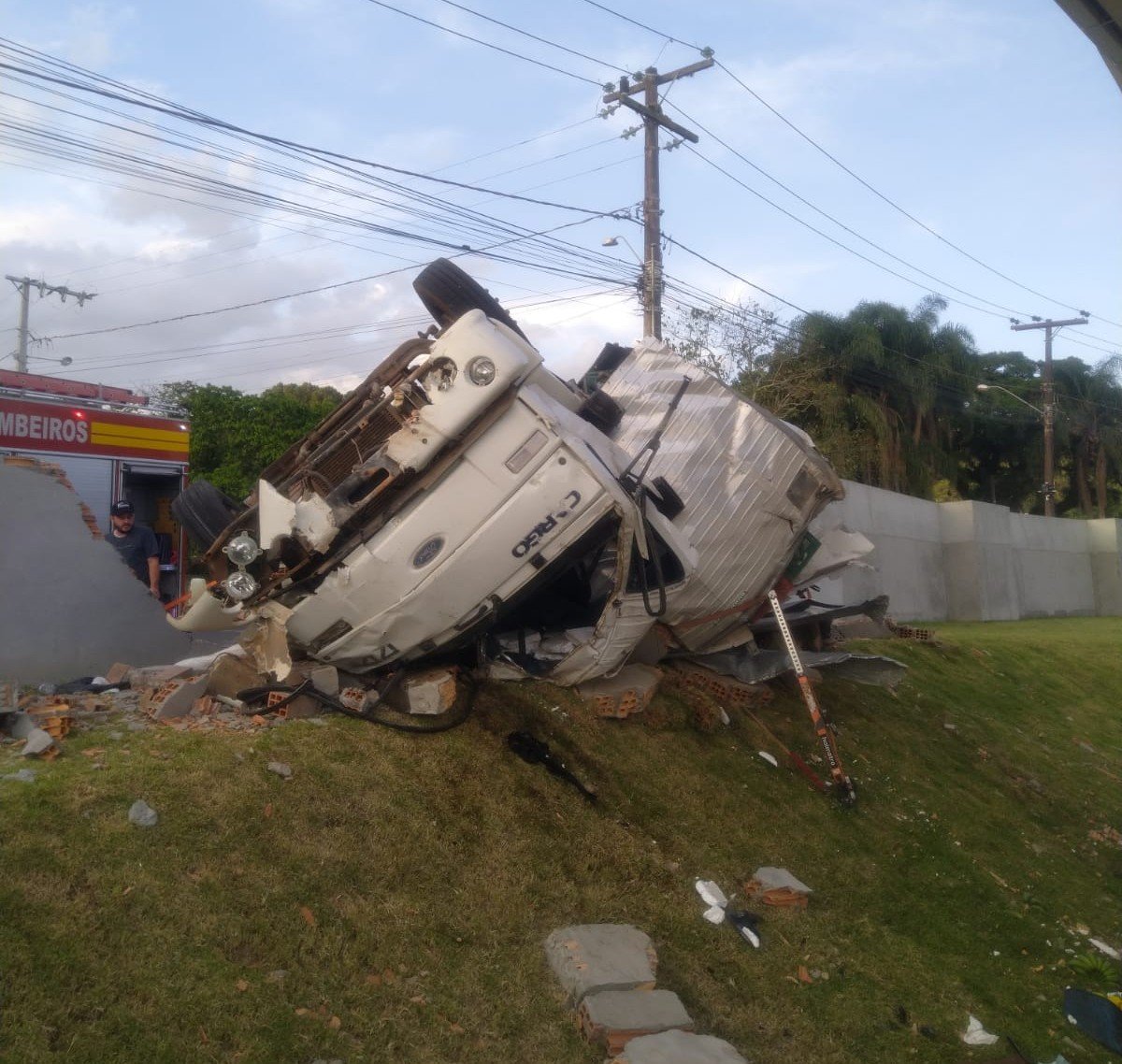 A o muro rompido e a carreta tombada pelo jardim da propriedade marcaram a violência do impacto, que mobilizou três viaturas de socorro e interditou parte da via para o trabalho de socorro.