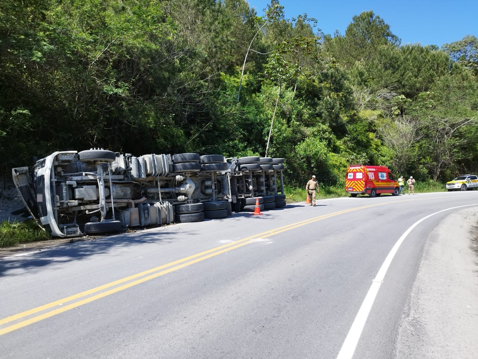 Um caminhoneiro de 30 anos ficou ferido após o tombamento da carreta que dirigia na manhã desta segunda-feira (13), na Rodovia Pedro Merísio, no bairro Pedras Grandes, em Botuverá. O acidente ocorreu por volta das 8h20 e mobilizou equipes de resgate e segurança.