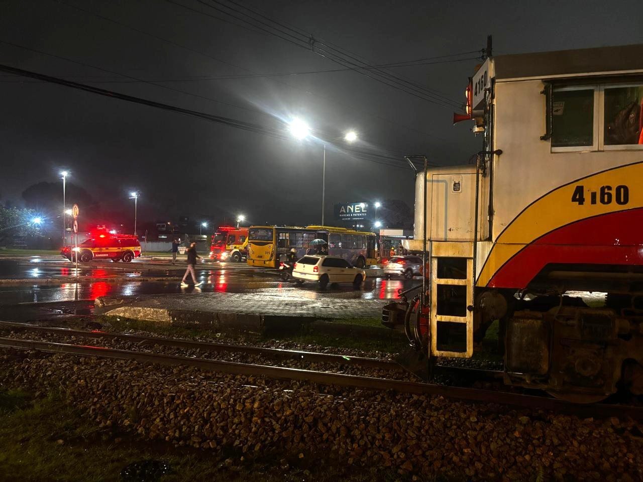 O Corpo de Bombeiros foi acionado para realizar o atendimento ao acidente de trânsito envolvendo a colisão entre uma locomotiva, conduzida por um homem, de 63 anos, e um ônibus conduzido por um homem, de 69 anos, que realizava o trajeto entre o Terminal do Pinheirinho e o Terminal da Próspera.