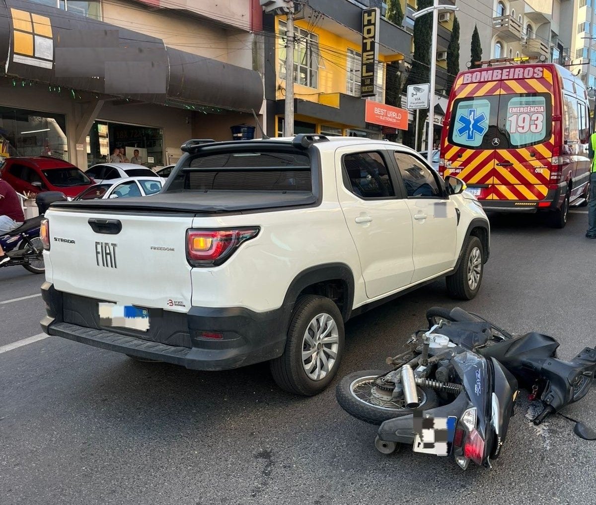 Colisão entre veículo e motocicleta deixa mulher ferida no Centro de Orleans