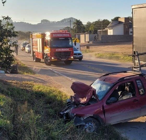 As equipes do Corpo de Bombeiros deslocaram-se para atendimento do acidente de trânsito que envolveu um caminhão Volkswagen/24.280 de cor branca e uma Fiat/Strada, de cor vermelha.