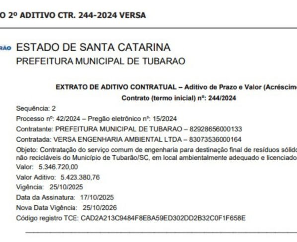 A prorrogação do contrato entre a Prefeitura de Tubarão e a Versa Engenharia Ambiental Ltda — empresa que até 2023 se chamava Serrana Engenharia e foi alvo da Operação Mensageiro — abriu um novo ponto de tensão política no município. A renovação, feita por meio do 2º aditivo contratual, estende a vigência até 25 de outubro de 2026 e acrescenta valor atualizado de R$ 5.423.380,76 ao contrato.