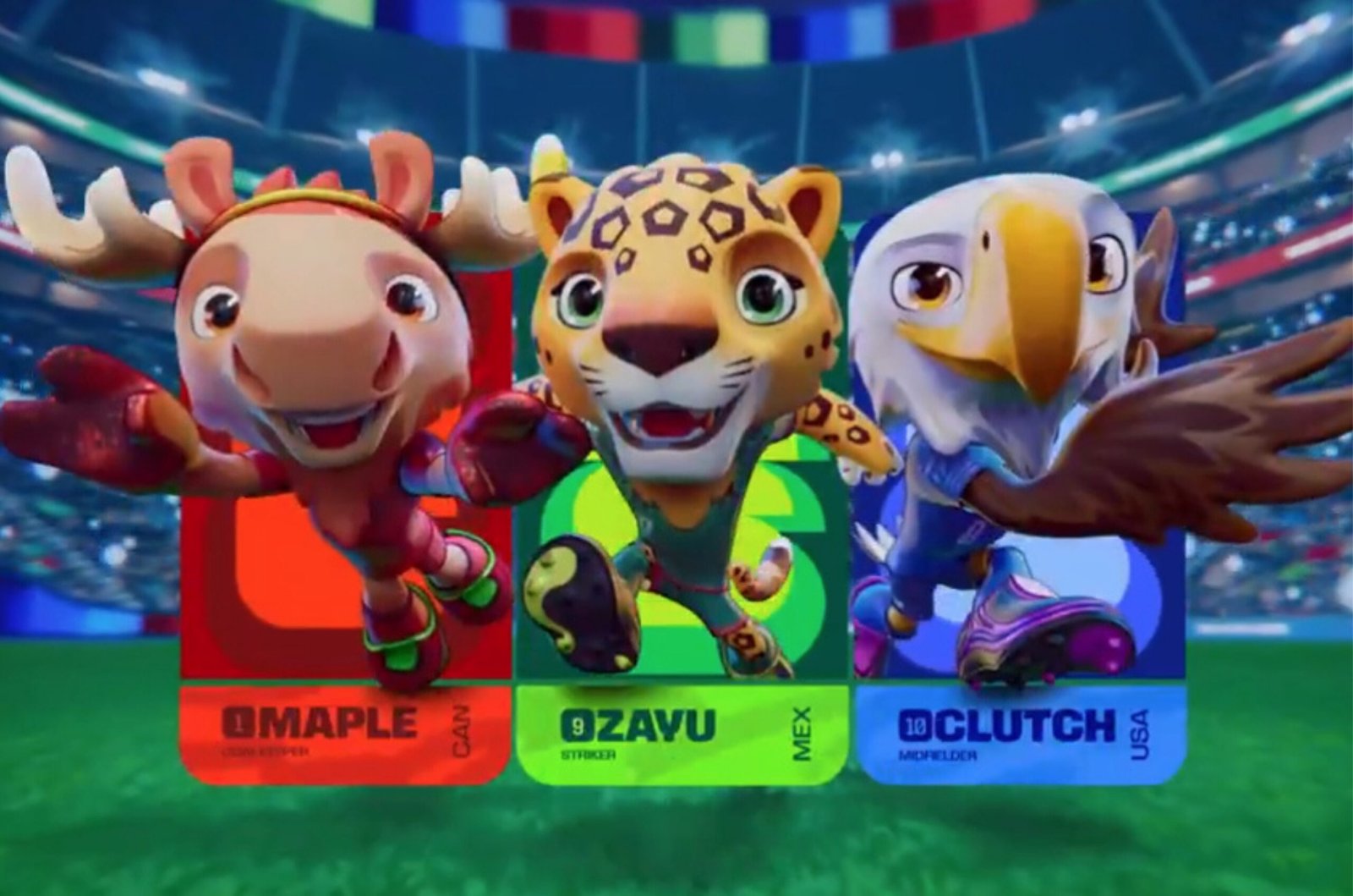 - Clutch, a águia-americana (Estados Unidos): meio-campista destemido, encarna a curiosidade e a diversidade cultural norte-americana, liderando dentro e fora de campo com otimismo.