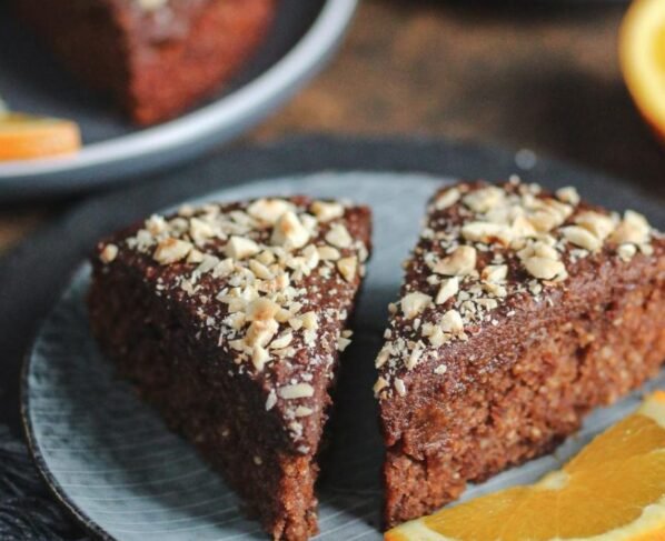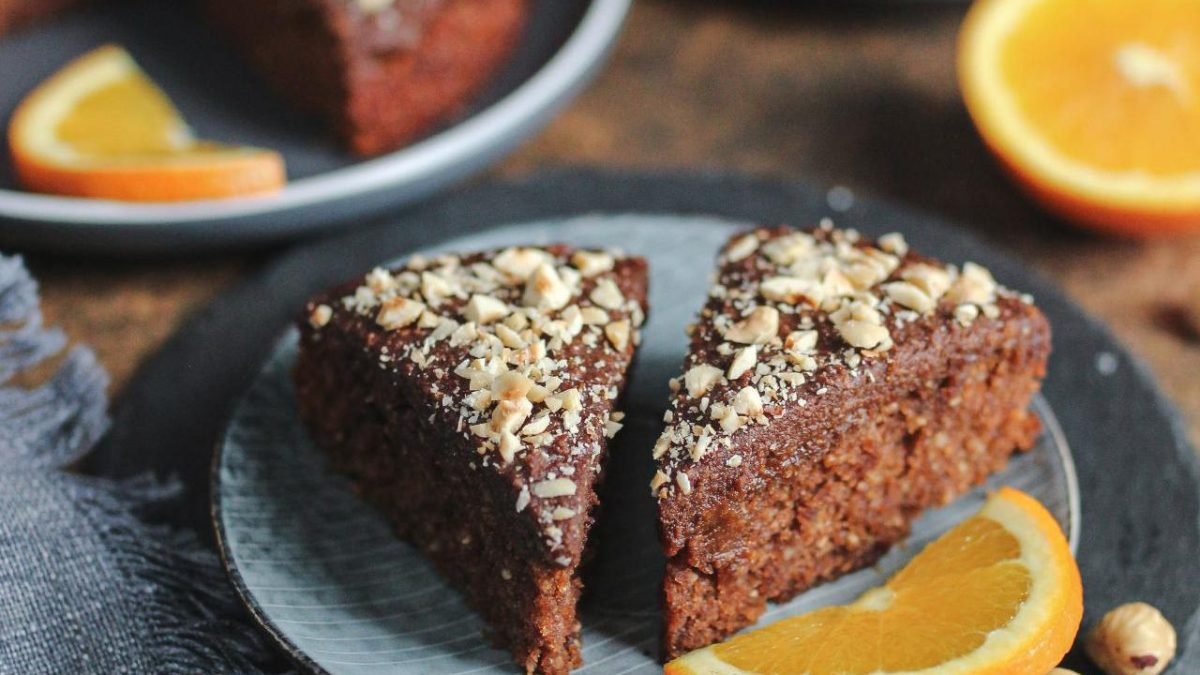 Esse bolo vegano se destaca pela umidade e aroma cítrico, obtidos com suco e raspas de laranja frescos. A ausência de ovos e laticínios não compromete a textura, que fica macia pela combinação de avelãs moídas, cacau em pó e óleo vegetal.