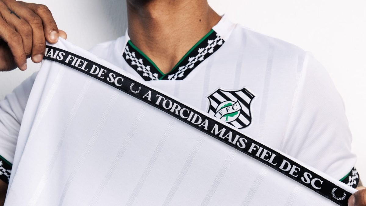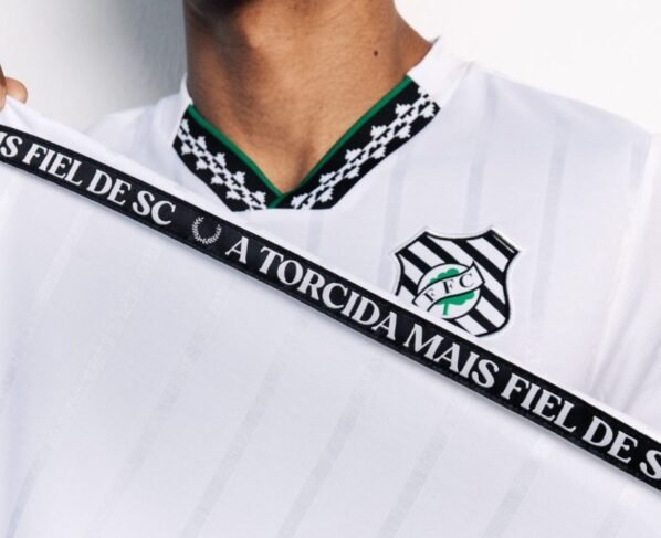 A camisa inclui elementos que celebram a história da Figueira, como o selo comemorativo “105 anos FFC” aplicado na parte inferior direita, além de uma fita personalizada na parte interna das costas com os dizeres “A torcida mais fiel de SC”.