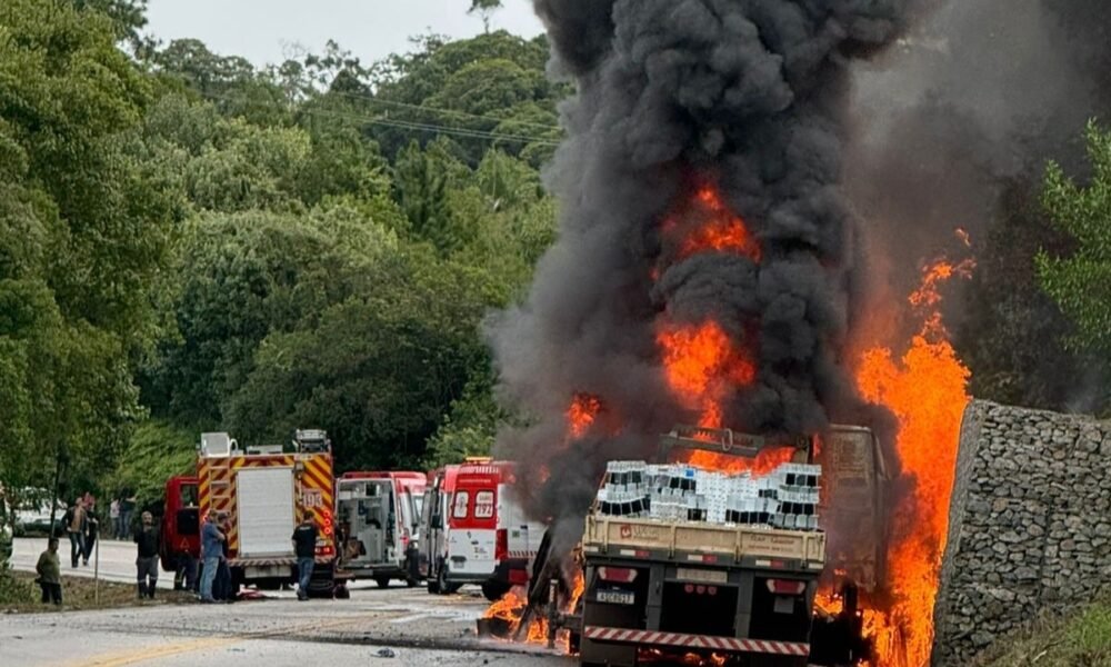 Na tarde desta quarta-feira (6), colisão envolveu três veículos, incluindo um caminhão carregado com madeira, que entrou em chamas