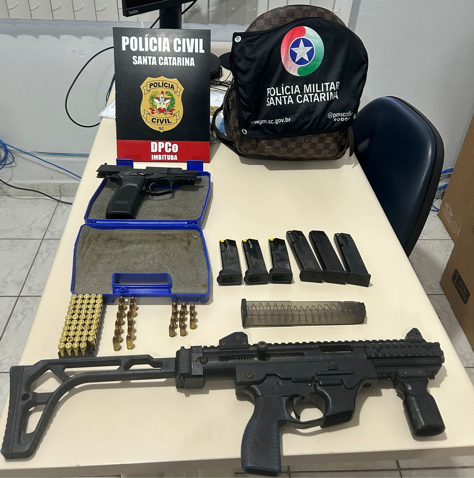 Durante a ação, foram apreendidos: uma submetralhadora de fabricação artesanal, calibre 9mm; uma pistola calibre 9mm com dois carregadores; três carregadores adicionais para pistola 9mm; um carregador para pistola calibre .380; 11 munições calibre .380; e 61 munições calibre 9mm.