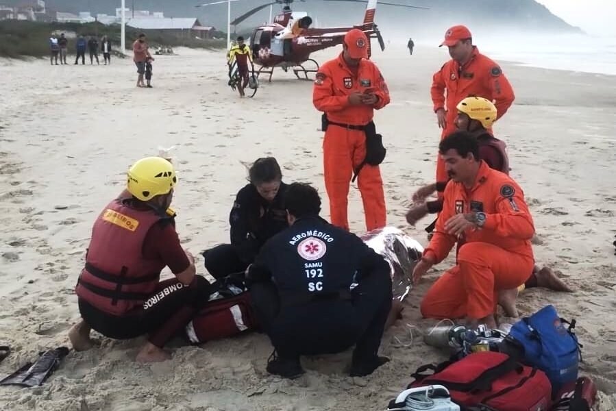 Durante o retorno à areia da Praia dos Ingleses, o Arcanjo-01 realizou o pouso e a equipe médica prestou o atendimento. O homem apresentava quadro de afogamento grau 2, estava consciente e orientado, queixava-se de dores na região cervical e lombar. O atendimento foi realizado pelo médico da equipe aeromédica.