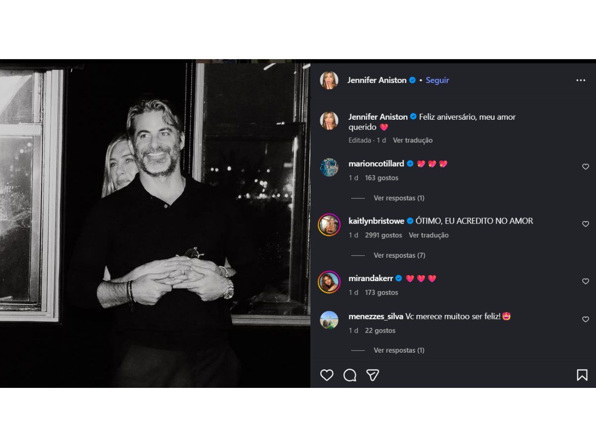 Jennifer Aniston confirmou seu namoro com o hipnoterapeuta Jim Curtis ao compartilhar uma foto em uma rede social na última segunda-feira (3/11). Ela comemorou o aniversário do amado com a publicação.