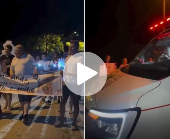 Os parentes aguardavam na rua com cartazes, música de gaita e violão, além de uma faixa conduzida à frente do veículo com a mensagem: “Bem-vindas, nossas guerreiras, Chirlei e Cecília”.