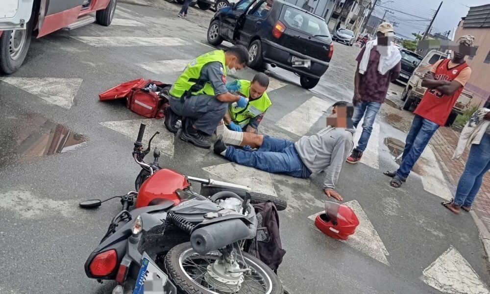 Na tarde desta sexta-feira, 23, por volta das 14h30, uma colisão entre motocicleta e automóvel deixou um motociclista ferido, na Rua Orlando Ferreira, no bairro Machados, em Navegantes.