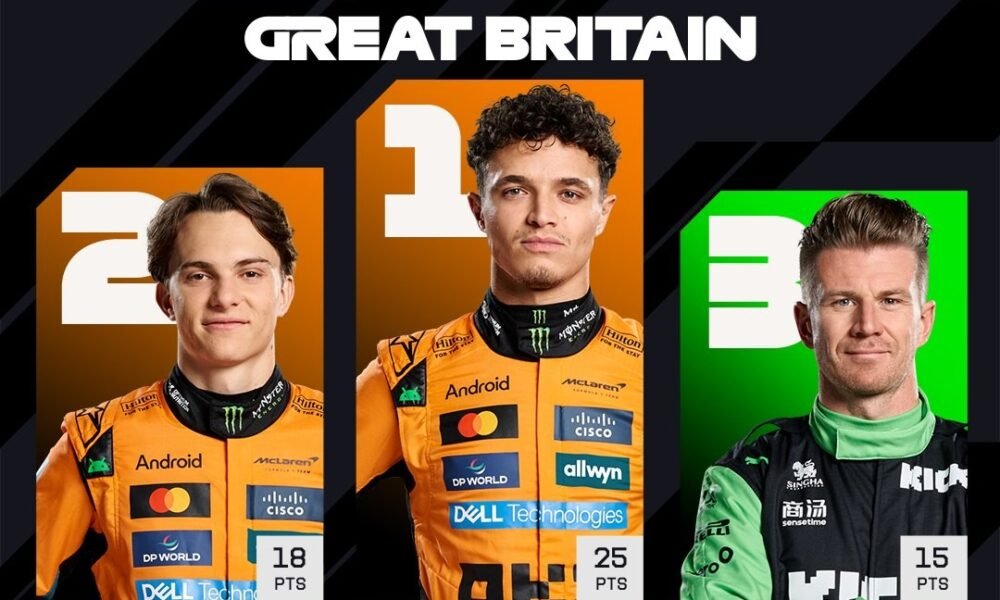 Lando Norris conquistou sua primeira vitória consecutiva na Fórmula 1 no chuvoso e caótico Grande Prêmio da Inglaterra disputado neste domingo (6).
