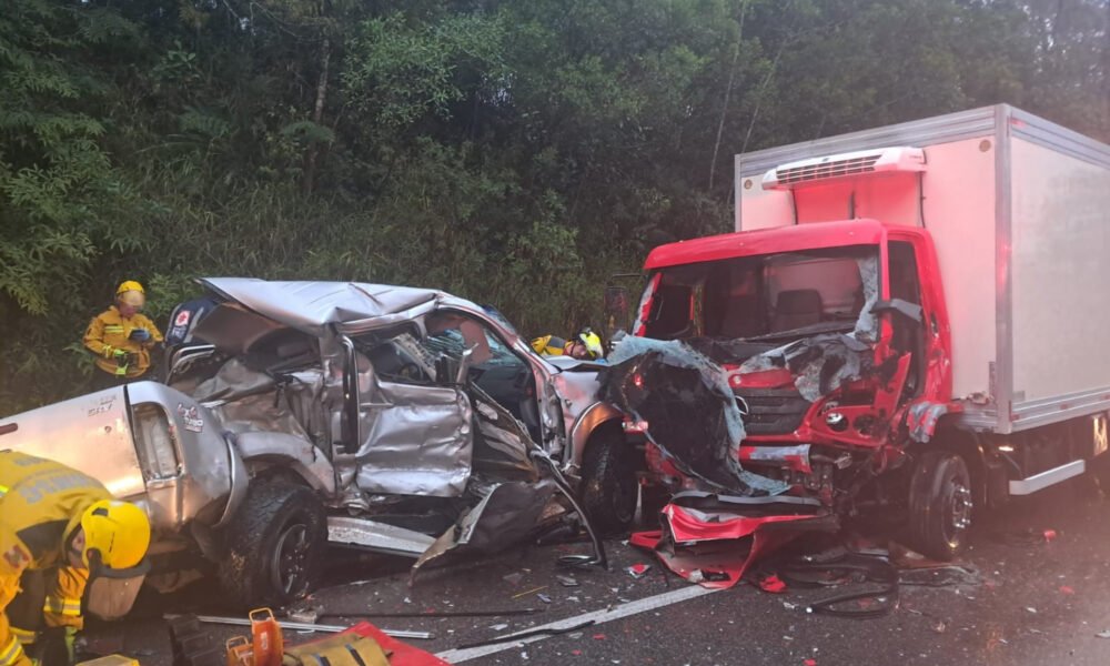 Acidente entre caminhonete e caminhão deixou duas vítimas fatais; resgate mobilizou bombeiros por mais de duas horas