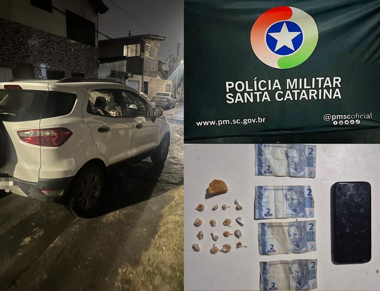 Os policiais foram acionados após denúncia informando que um suspeito estaria vendendo entorpecentes na região. No local, os militares flagraram o homem em atitude suspeita próximo a um veículo com dois ocupantes.