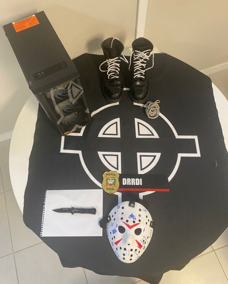 Durante as buscas, foram apreendidos objetos, símbolos nazistas e equipamentos eletrônicos, que serão encaminhados para perícia e análise técnica. O material servirá para esclarecer o caso e identificar se há outros envolvidos.