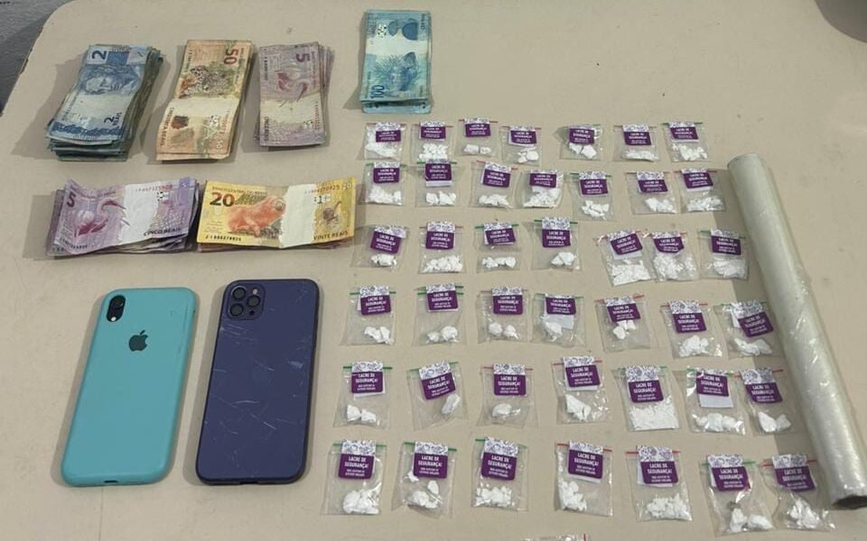 Em seguida, os policiais militares foram até a residência de onde o homem havia saído. No local, duas pessoas se identificaram como moradoras do imóvel, onde foram encontradas 42 porções de cocaína, já separadas e embaladas, com a mesma etiqueta da droga apreendida anteriormente.